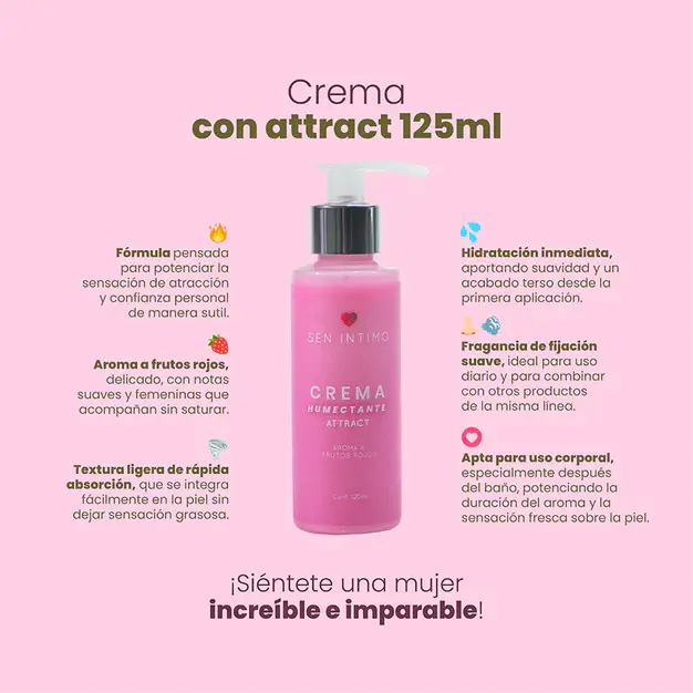 Tu piel habla antes de que digas una sola palabra. La crema humectante corporal Attract de Sen Íntimo hidrata profundamente, deja una fragancia suave a frutos rojos y potencia tu sensación de atracción y confianza desde la primera aplicación.
